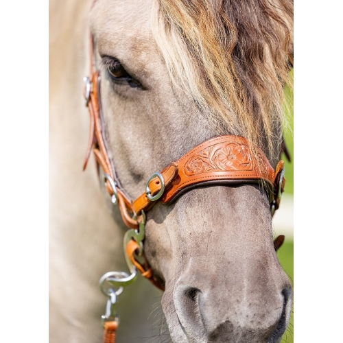 The EDIX ED4 of the "Rose Collection" is a high-quality bitless bridle, designed as a base for the hackamore system of your choice. Crafted from durable Argentinian cow leather and finished with a hand-decorated tooled noseband and crownpiece, this bridle combines both style and function for riders who prefer a hackamore setup.